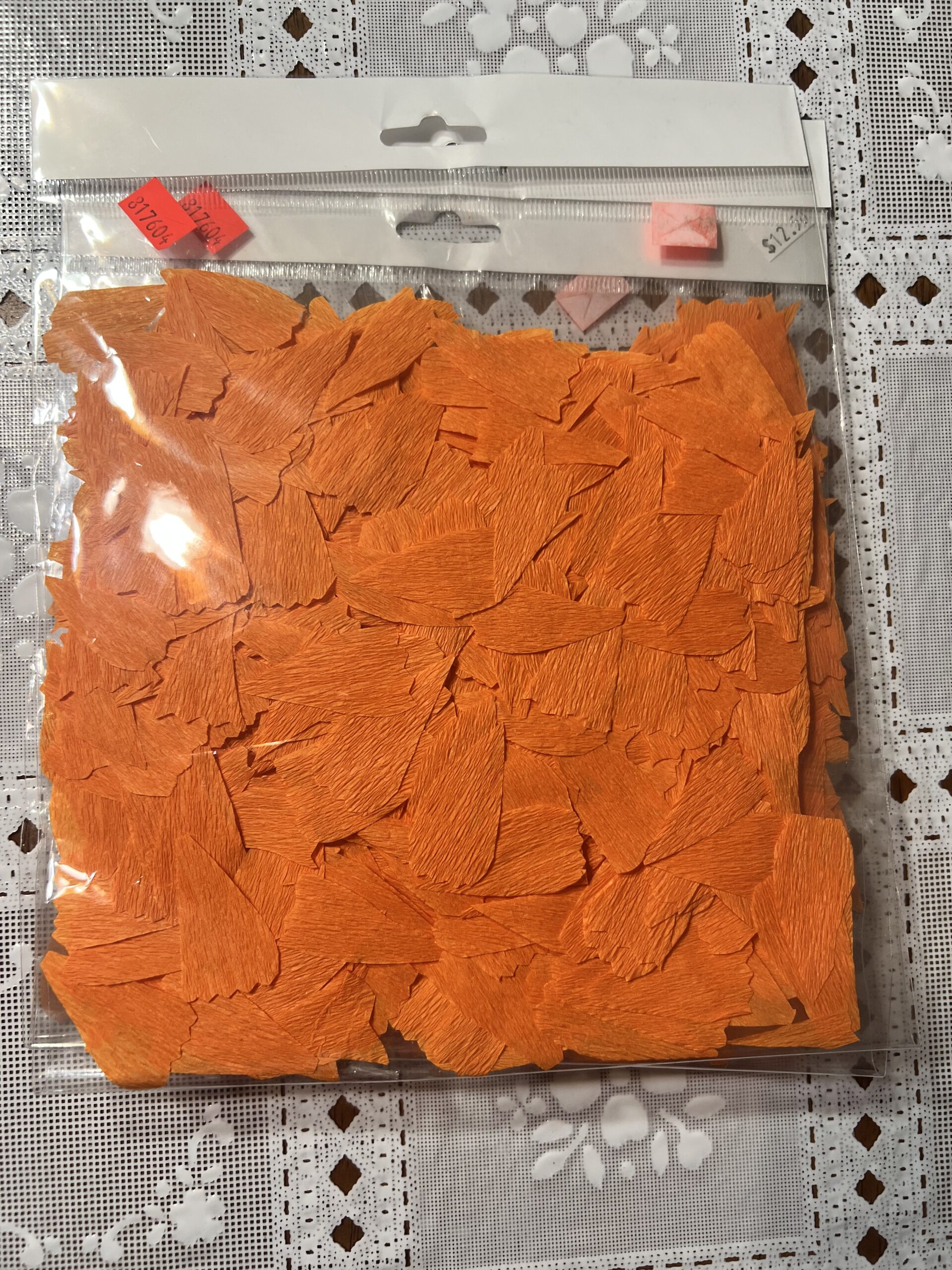 10 GRS DE CONFETI EN FORMA DE PETALO DE FLOR DE CEMPASUCHIL COLOR NARANJA, IDEAL PARA SIMULAR PETALOS EN EL ALTAR DE DIA DE MUERTOS